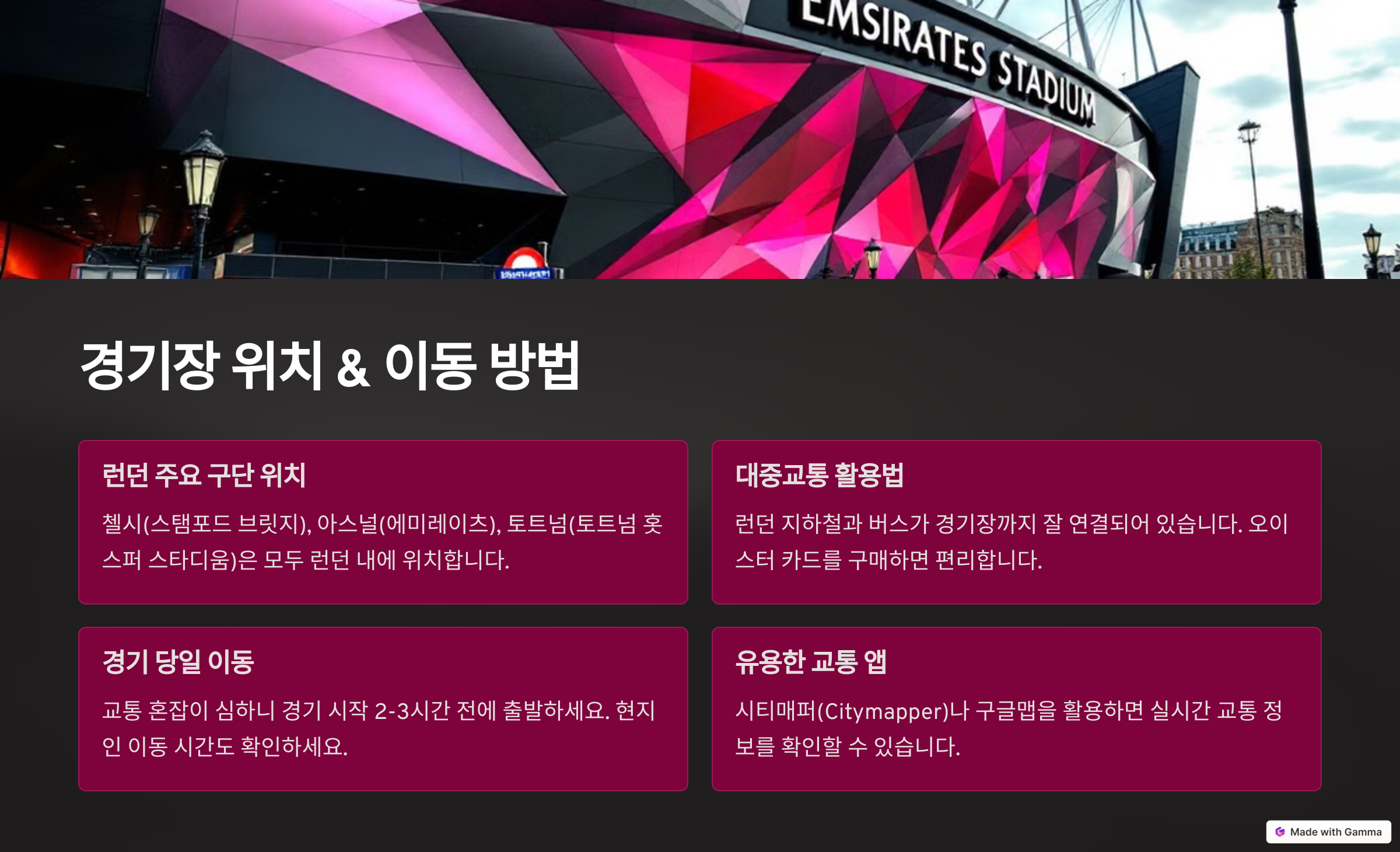 📌 1. 런던 경기장 이동 방법 (첼시, 아스널, 토트넘)