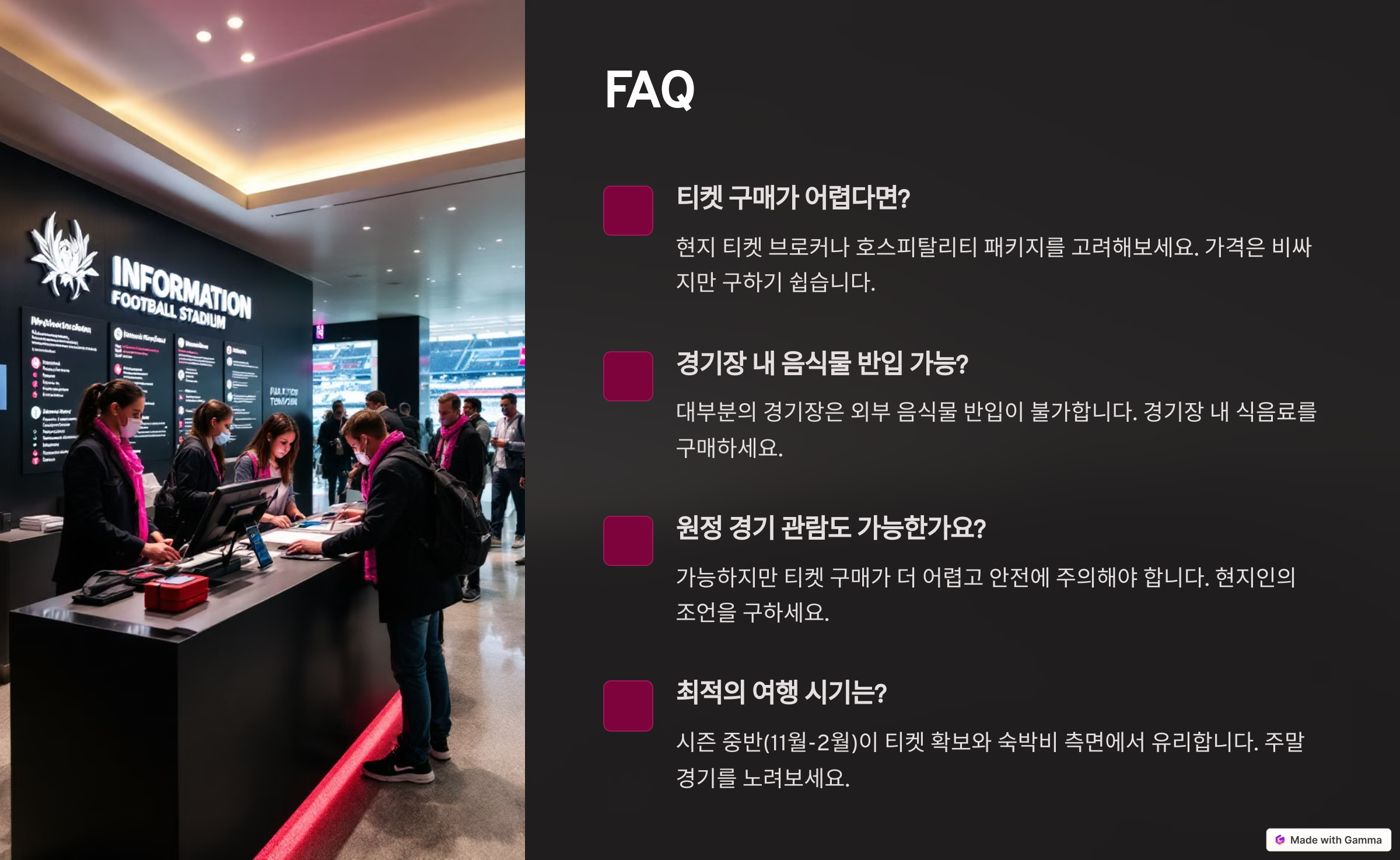 - 경기장 이동 방법과 여행 동선을 짜는 팁을 얻을 수 있어요.