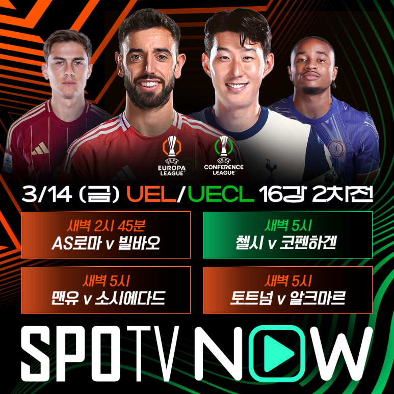 | 토트넘 VS 알크마르 | 3월 14일(금) 05:00 | 토트넘 홋스퍼 스타디움 | SPOTV PRIME, SPOTV NOW |