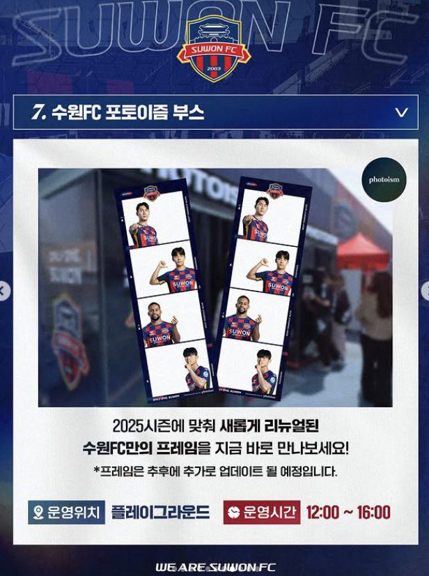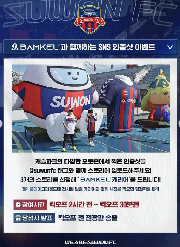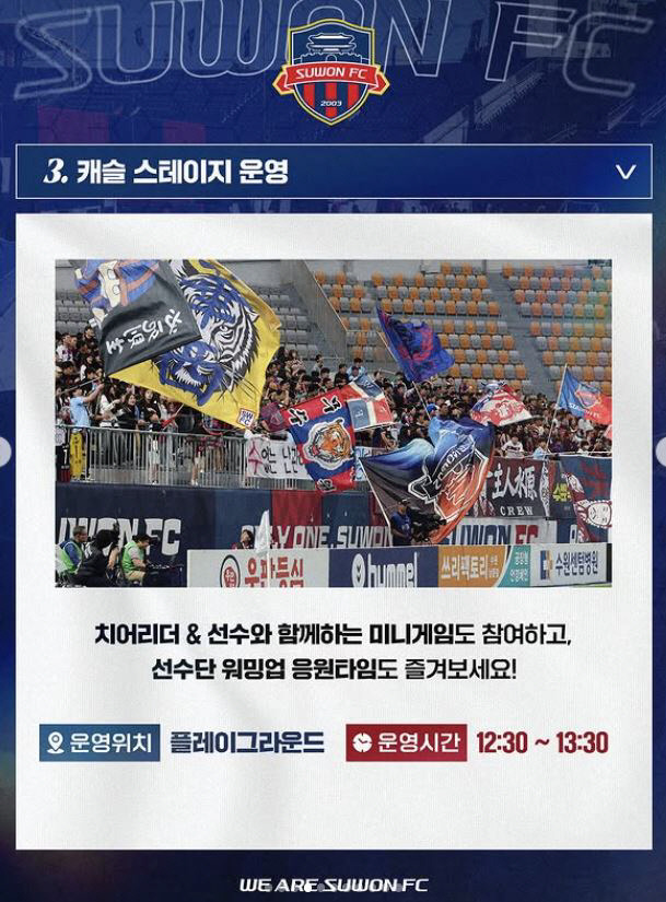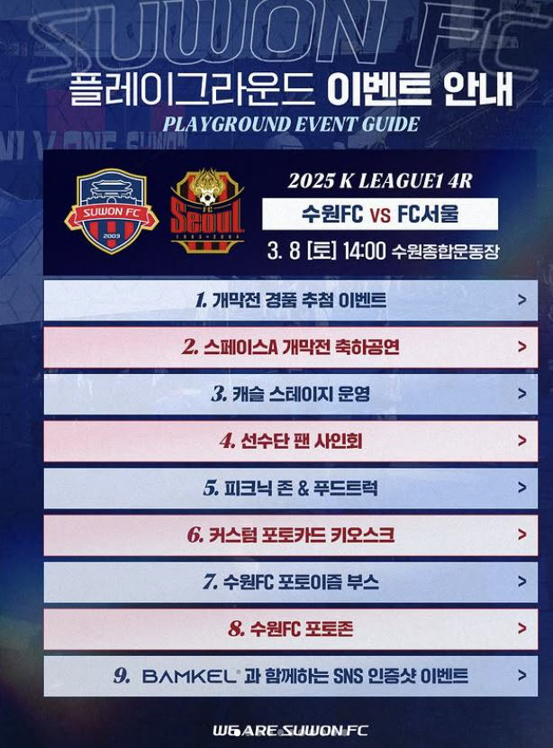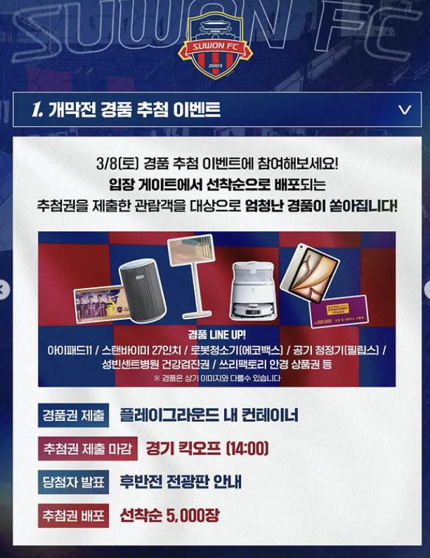 수원FC는 팬들의 기다림에 보답하기 위해 경기장 안팎에서 다채로운 이벤트를 준비하였습니다. 애플 아이패드, LG 스탠바이미, 에코백스 로봇청소기, 필립스 공기청정기 등 푸짐한 경품 추첨 이벤트를 비롯해, 스페이스A의 축하 공연, 캐슬 스테이지 운영, 선수단 팬 사인회, 피크닉존, 푸드트럭, 커스텀 포토카드 키오스크, 포토존, SNS 인증샷 이벤트 등 다양한 즐길 거리가 마련되어 있습니다.
