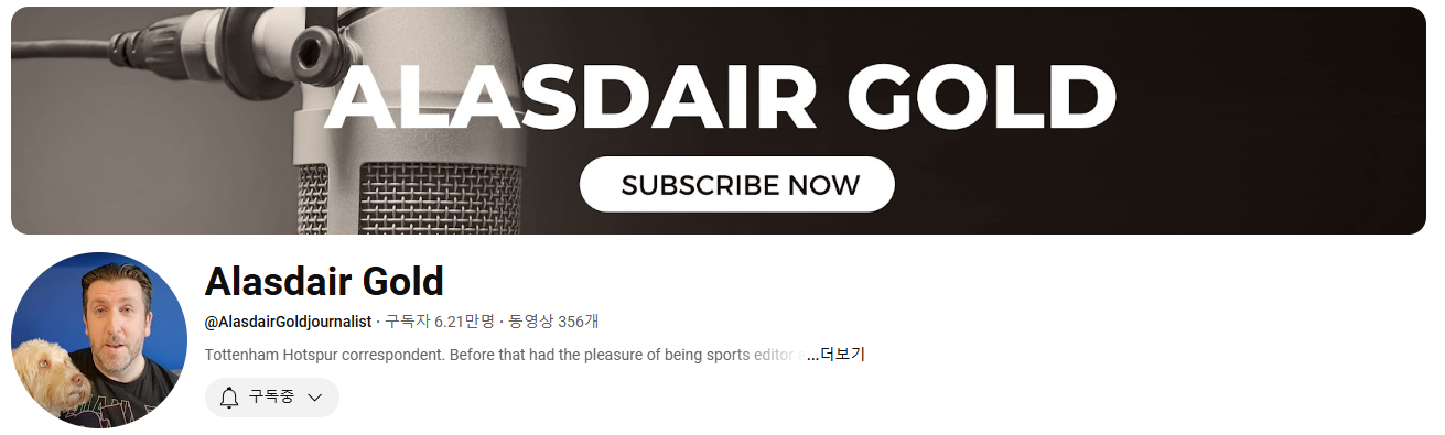 영국 축구 언론사 '풋볼 런던' 소속이자 토트넘 전담 기자인 Alasdair Gold 기자입니다. 이 채널의 영상은 1시간 가까이라 평소에는 잘 보지 않는데, 장거리 출장길이나 시간이 많이 빌때 가끔 보는 채널입니다. 영상 편집이라고는 1도 없는 날것 영상 그 자체이지만 Gold 기자가 취재한 토트넘의 이야기를 들을 수 있습니다. 역시나 자막은 없어서 제가 이해하기에는 상당한 난이도가 있습니다.