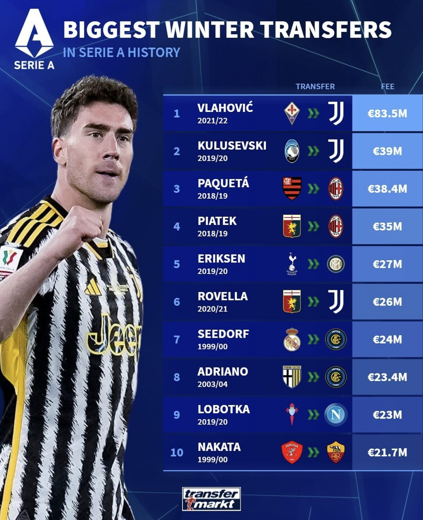 1위 블라호비치 (피오렌티나->유벤투스), 2위 클루셉스키 (애틀랜타->유벤투스), 파케타 (플레멩구->AC밀란)