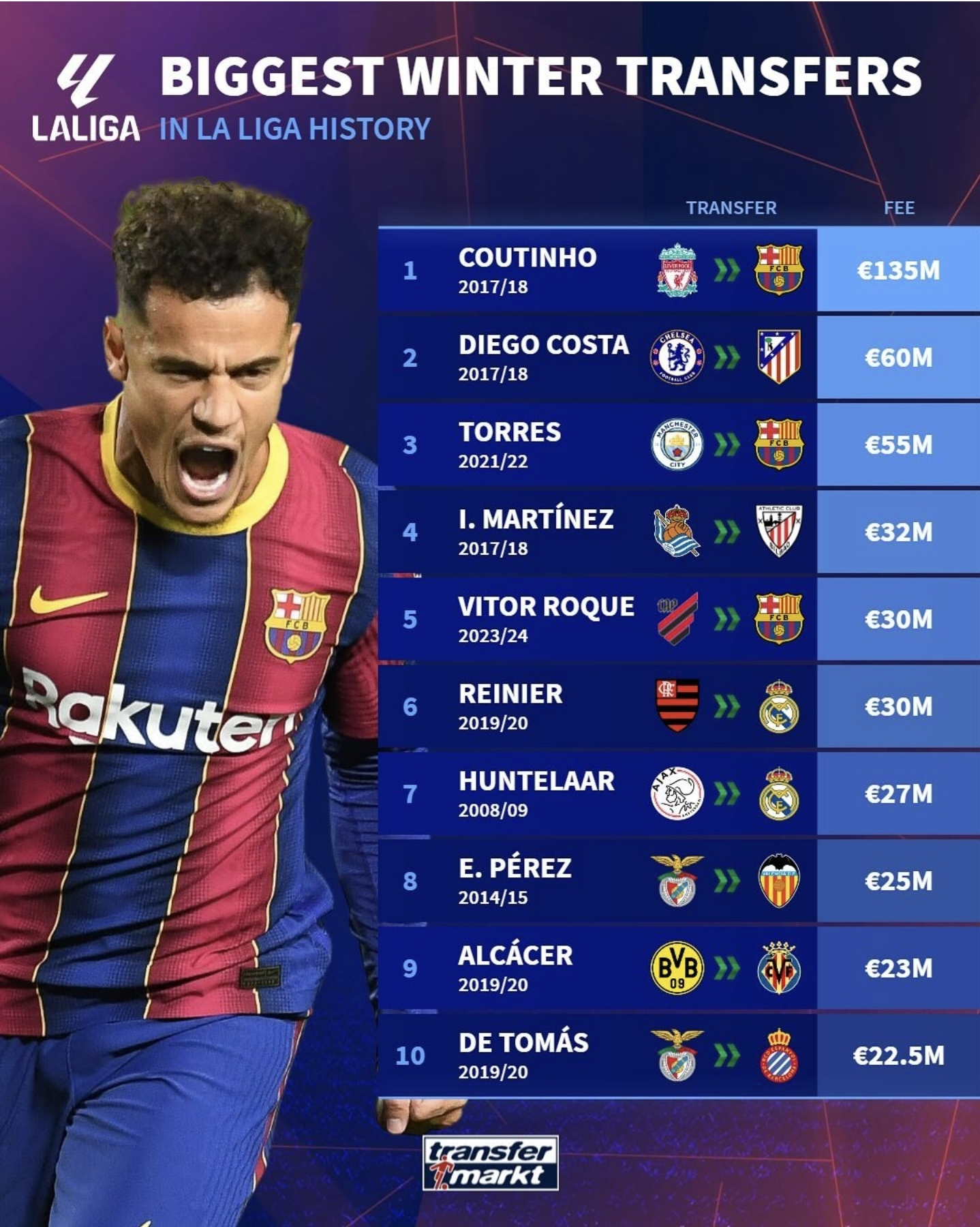 1위 쿠티뉴 (리버풀->바르셀로나), 2위 디에고 코스타 (첼시->아틀레티코 마드리드), 3위 페란 토레스 (맨시티->바르셀로나)