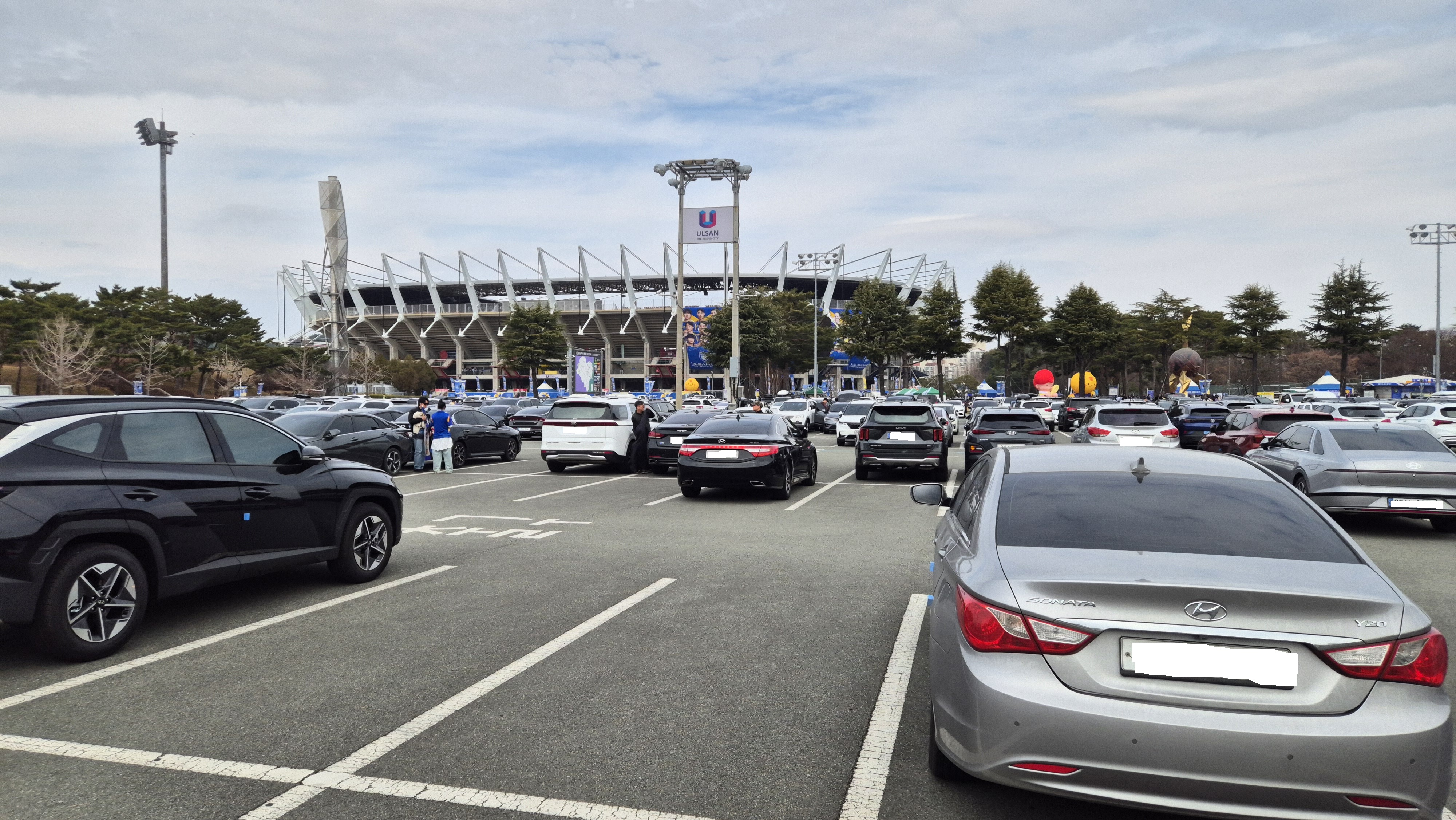 그리고 주차 정보를 알려드릴게요. 이 날 경기 시작 시간이 14시였는데, 저는 운전을 해서 11시30분쯤에 경기장 주차장에 도착했습니다. 그런데 워낙 인기 경기다보니 경기 시작 2시간 30분 전에 도착해도 경기장 주차장이 대부분 팬들 차량들로 가득했어요. 그래서 경기장 옆 길가에 주차를 하신분들도 꽤나 많았습니다. 인기 경기를 직관가시는 분들은 반드시 최소 2시간 전에는 도착하는걸 권장드립니다.