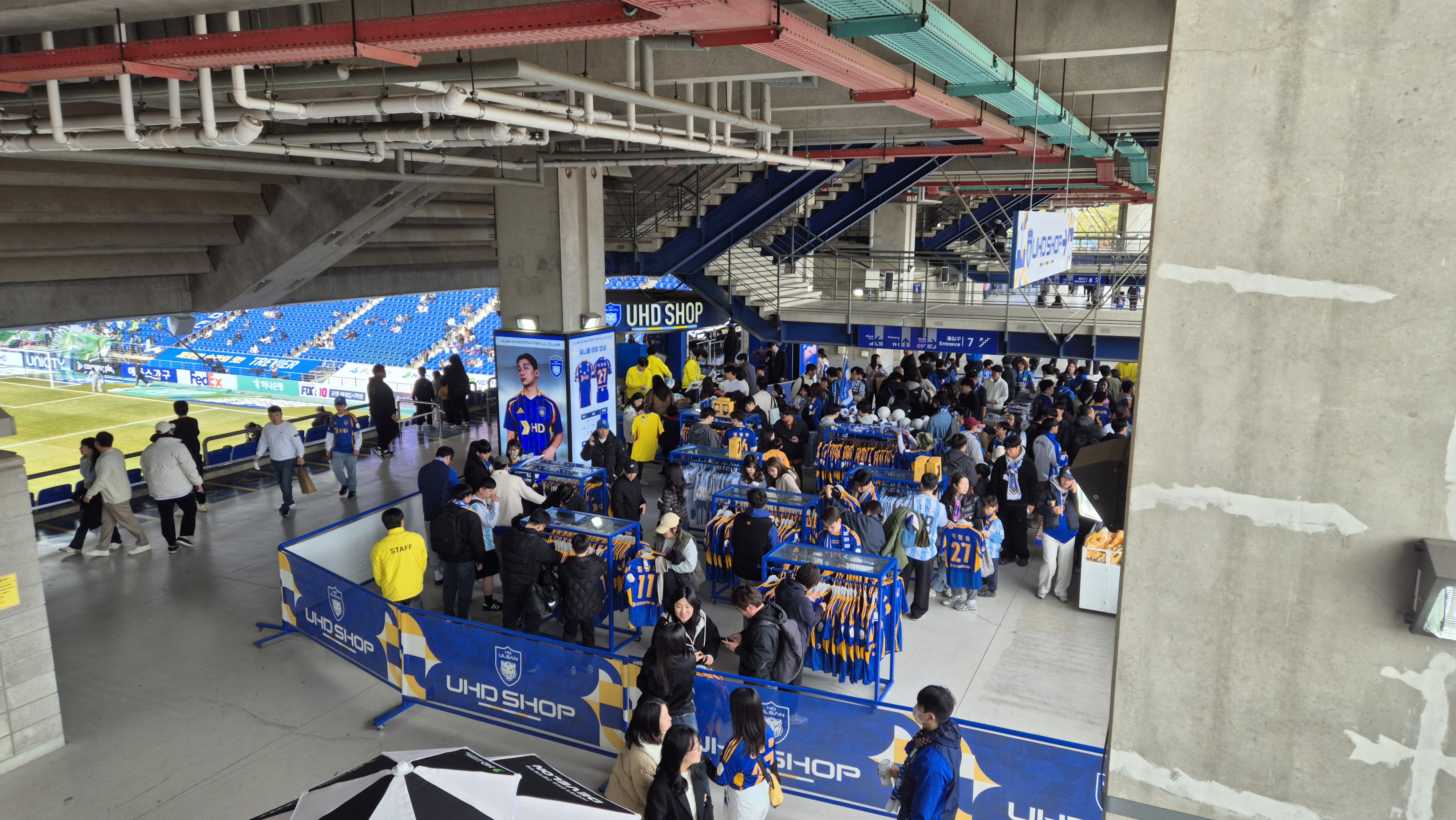 경기장 곳곳에 MD샵도 있어! 울산HD 공식 스토어에서는 유니폼, 머플러, 키링 등 다양한 상품을 판매하고 있어요. 특히 경기 날 한정으로 나오는 스페셜 굿즈가 있으니 체크해보세요! 😊