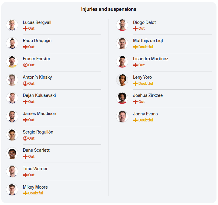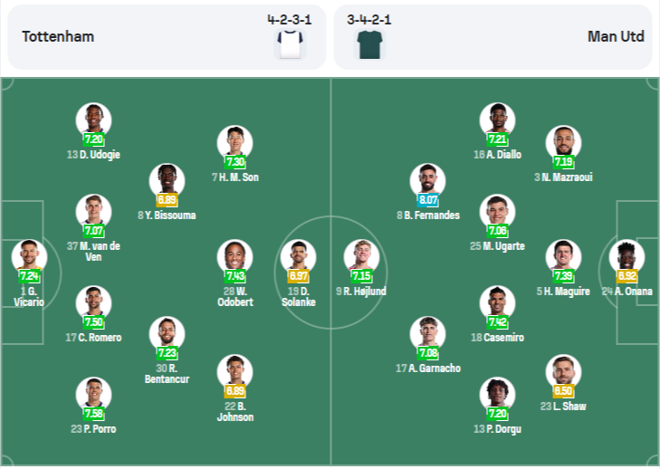 토트넘은 4-3-3 혹은 4-2-3-1 형태로 유연하게 전술을 조정합니다. 포스테코글루 감독은 빌드업의 안정성을 중시하며, 특히 로메로와 판 더 펜이라는 수비 중심 자원을 수비진에 깊이 배치하면서 실점 가능성을 최소화하려 합니다. 중앙 미드필더인 사르와 벤탄쿠르가 후방 빌드업을 담당하며 측면의 포로, 솔로몬 등이 측면을 적극적으로 공략합니다. 토트넘의 승부처는 역시 도미닉 솔랑케의 최전방 움직임입니다. 수비수를 끌고 다니는 활동량과 포스트 플레이, 순간적인 침투는 맨유의 수비 라인을 흔들기에 충분합니다. 여기에 손흥민이 가세할 경우, 맨유의 라인을 완전히 무너뜨릴 수 있는 변수로 작용할 수 있습니다.